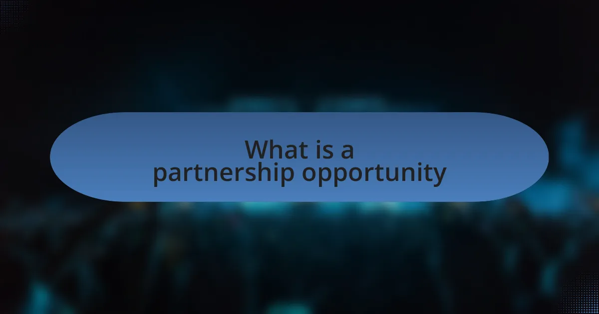 A partnership opportunity refers to a chance for collaboration between two or more entities, often aimed at achieving common goals in the music industry. For instance, I remember when I was approached by a local artist looking to combine efforts for a unique album project. The excitement in their voice reflected a genuine desire to create something impactful together, showcasing how partnership opportunities can bring diverse talents together for greater creativity.
